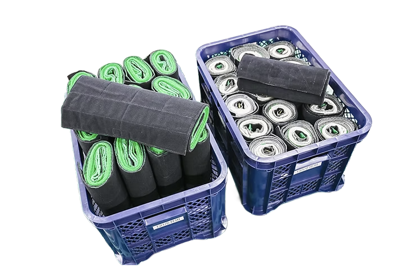 マジックテープ式で巻き終わりを止められるため、コンテナに収納できます。倉庫内の保管にも便利です。